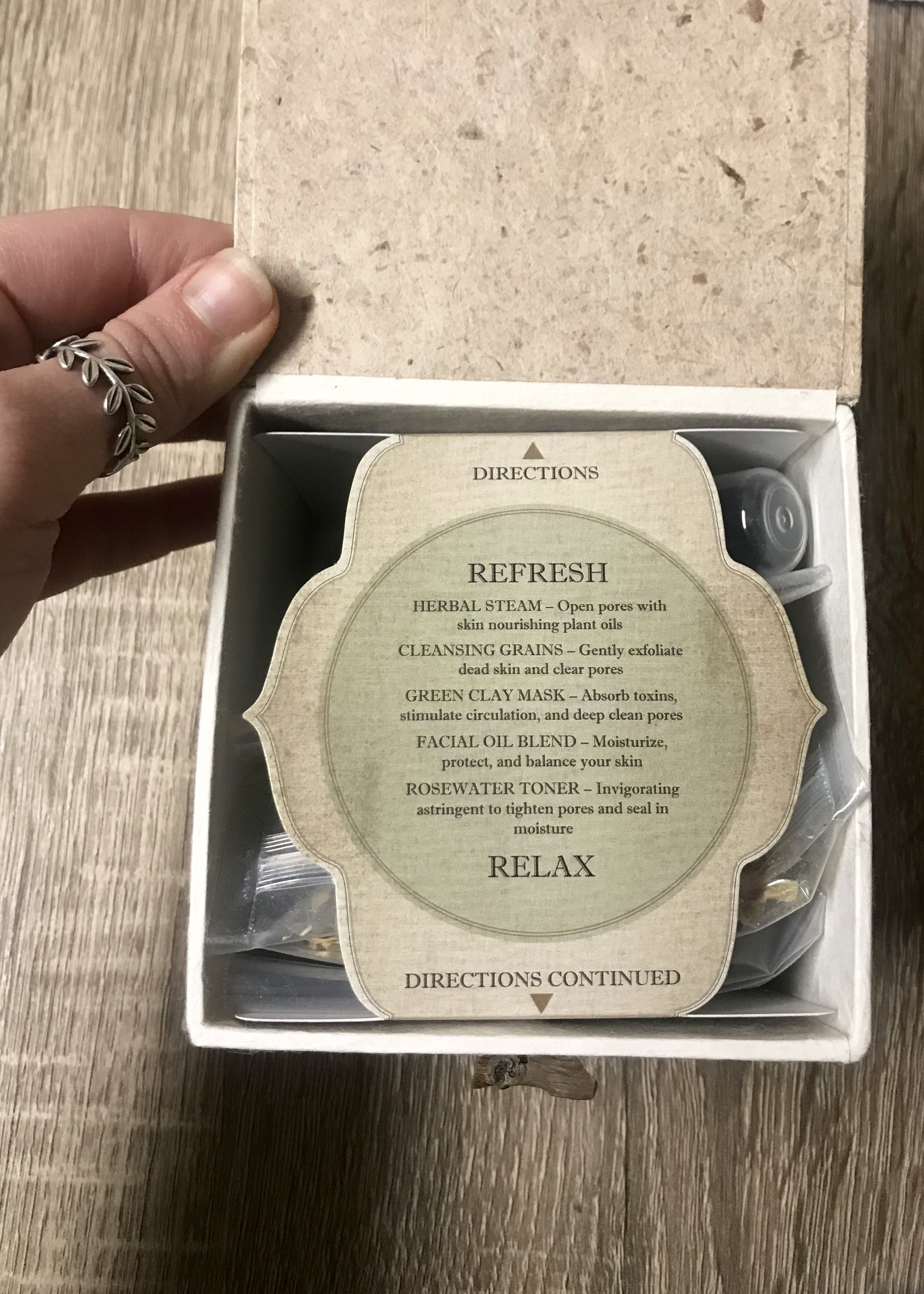 The mask is French Green Clay which is great for absorbing toxins, oils and other impurities from your skin. Who doesn’t love a little at-home face mask?